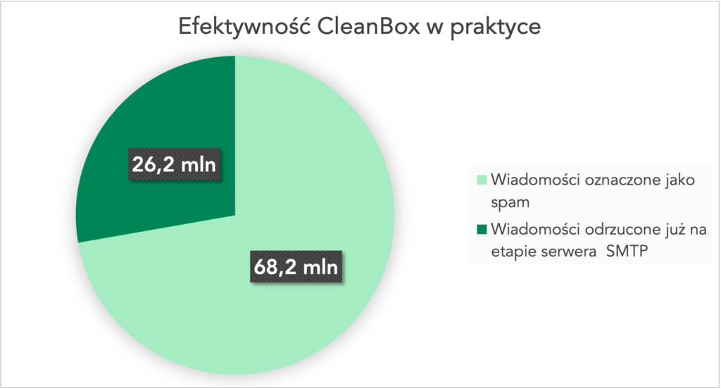 Łącznie zatrzymaliśmy ponad 94 miliony niechcianych wiadomości – czyli co piątą wiadomość kierowaną do naszych klientów. To ponad czterokrotnie więcej! zakwalifikowanych jako spam wiadomości niż miało to miejsce w przypadku poprzedniego systemu.