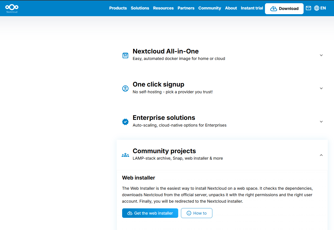 Aby pobrać instalator, przejdź na stronę: https://nextcloud.com/install/, a następnie znajdź i rozwiń pozycję Web installer i kliknij niebieski przycisk o tej samej nazwie.